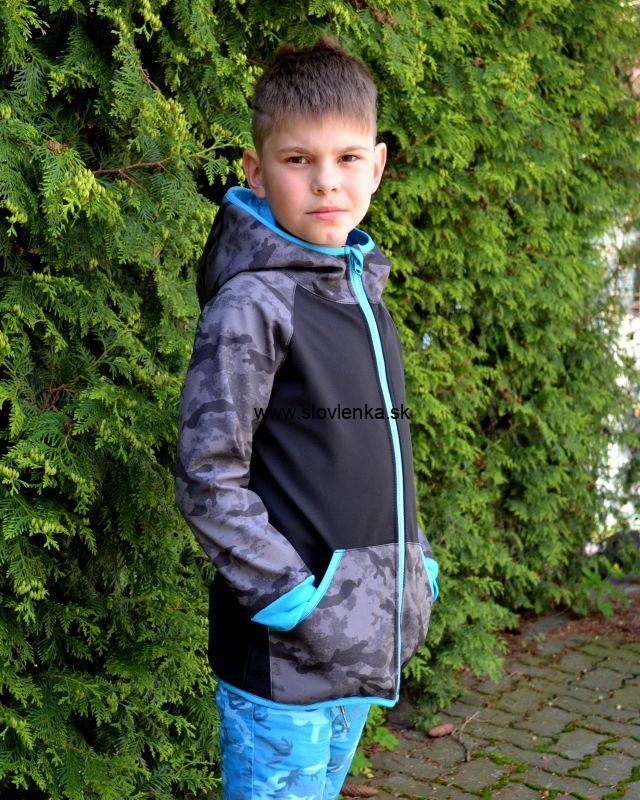 Softshellová bunda - maskáčová šedá/tyrkysové doplnky, veľ.80-116